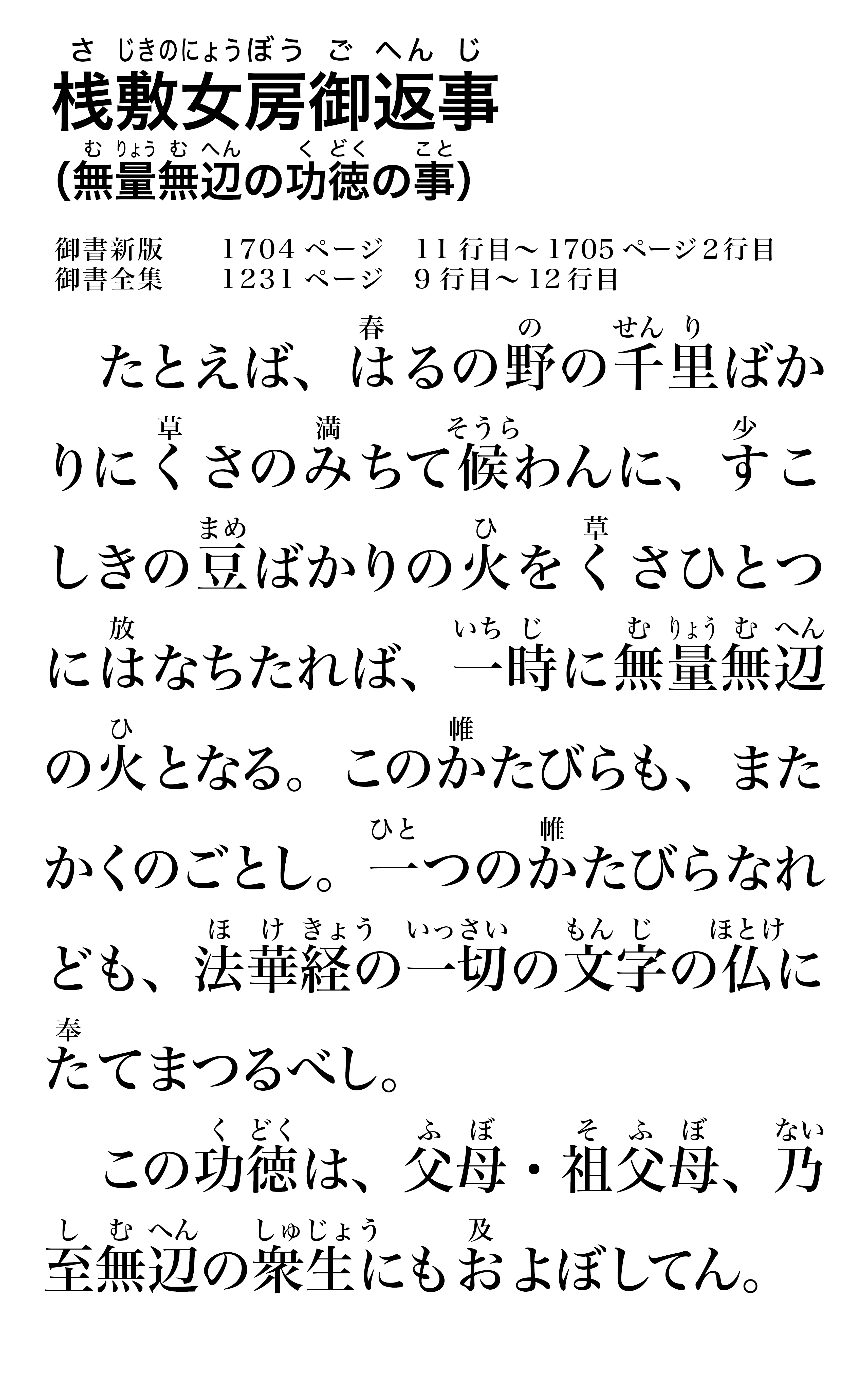 各種資料御文  通解たとえば、春の野が千里ほどにも広がって草が生い茂っている所に、豆粒ほどの小さな火を一つの草に放つと、いっぺんに無量無辺の火となる。(あなたが供養した)この帷子もまた同じことである。一つの帷子ではあるが、法華経の一切の文字の仏に供養したことになるのである。 この功徳は、父母、祖父母、さらに限りなく多くの人々にも及ぶに違いない。 参考◎桟敷女房御返事(無量無辺の功徳の事)